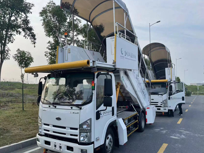 Pasažieru kāpņu priekšējā platforma ir aprīkota ar vadības ierīci kāpņu korpusa un platformas izplešanās un saraušanās leņķa precīzai regulēšanai, platforma ir aprīkota ar LED apgaismojumu, visas daļas, kas saskaras ar lidmašīnu, ir aprīkotas ar nesaskrāpējamām gumijas sloksnēm, platforma un bīdāmā sānu paneļa priekšējais gals ir aprīkots ar pretsadursmes gumiju un efektīvu fotoelektrisko sadursmi, kas var novērst efektīvu fotoelektrisko sadursmi. lidmašīna.